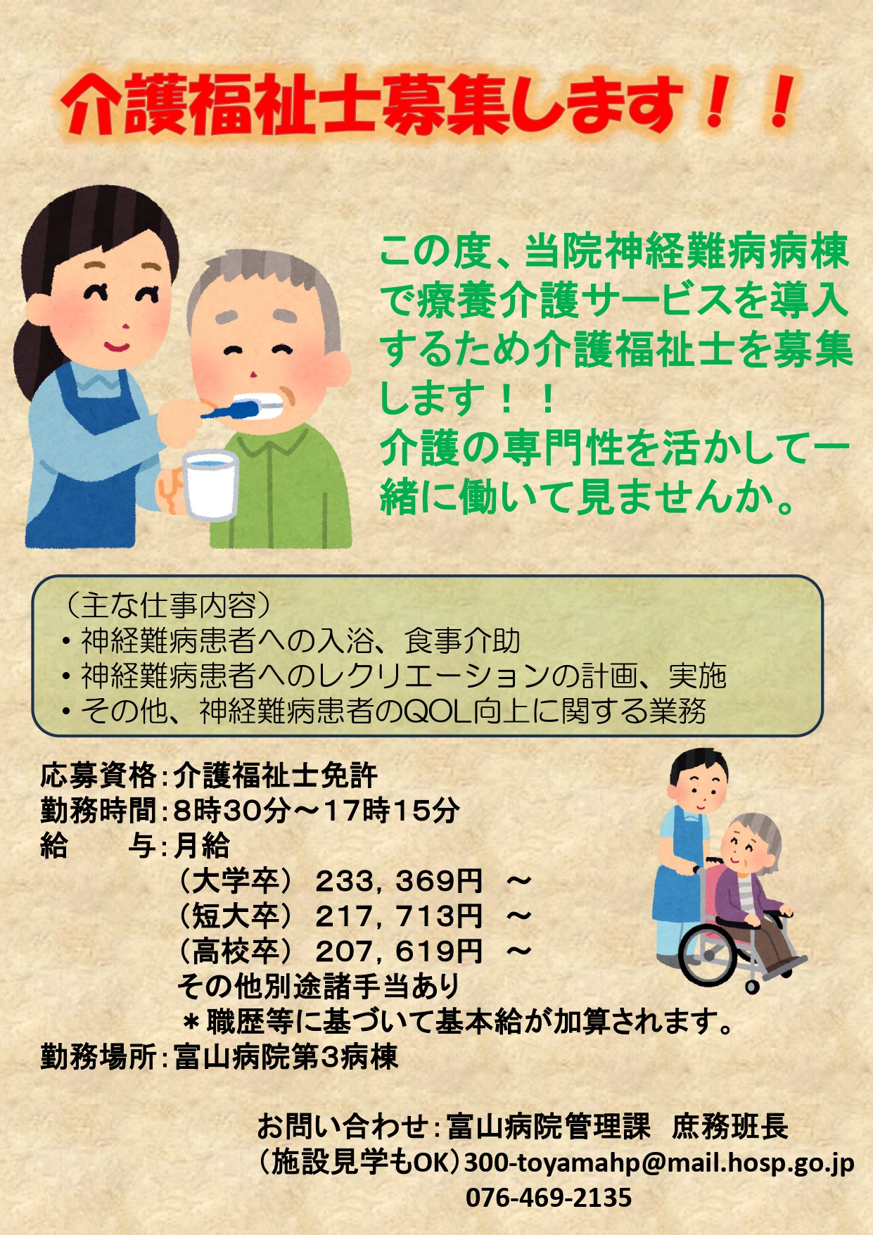 | 応募方法 | 1.提出書類 ・履歴書(写真貼付) ・介護福祉士の資格証(写) ・卒業見込み証明書(令和8年3月介護福祉士資格取得見込みの方) ※提出書類はお返しできませんのでご了承ください。 2.提出先・問い合せ先 独立行政法人国立病院機構 富山病院 管理課 庶務班長 宛 〒939-2692 富山県富山市婦中町新町3145 TEL : 076-469-2135(代表)内線2440 E-mail:300-toyamahp@mail.hosp.go.jp 3.応募期限 随時 4.応募方法 郵送又は持参 施設見学をご希望の方は、応募方法:2.提出先・問い合わせ先 までご連絡ください。 お気軽にご連絡ください! |
