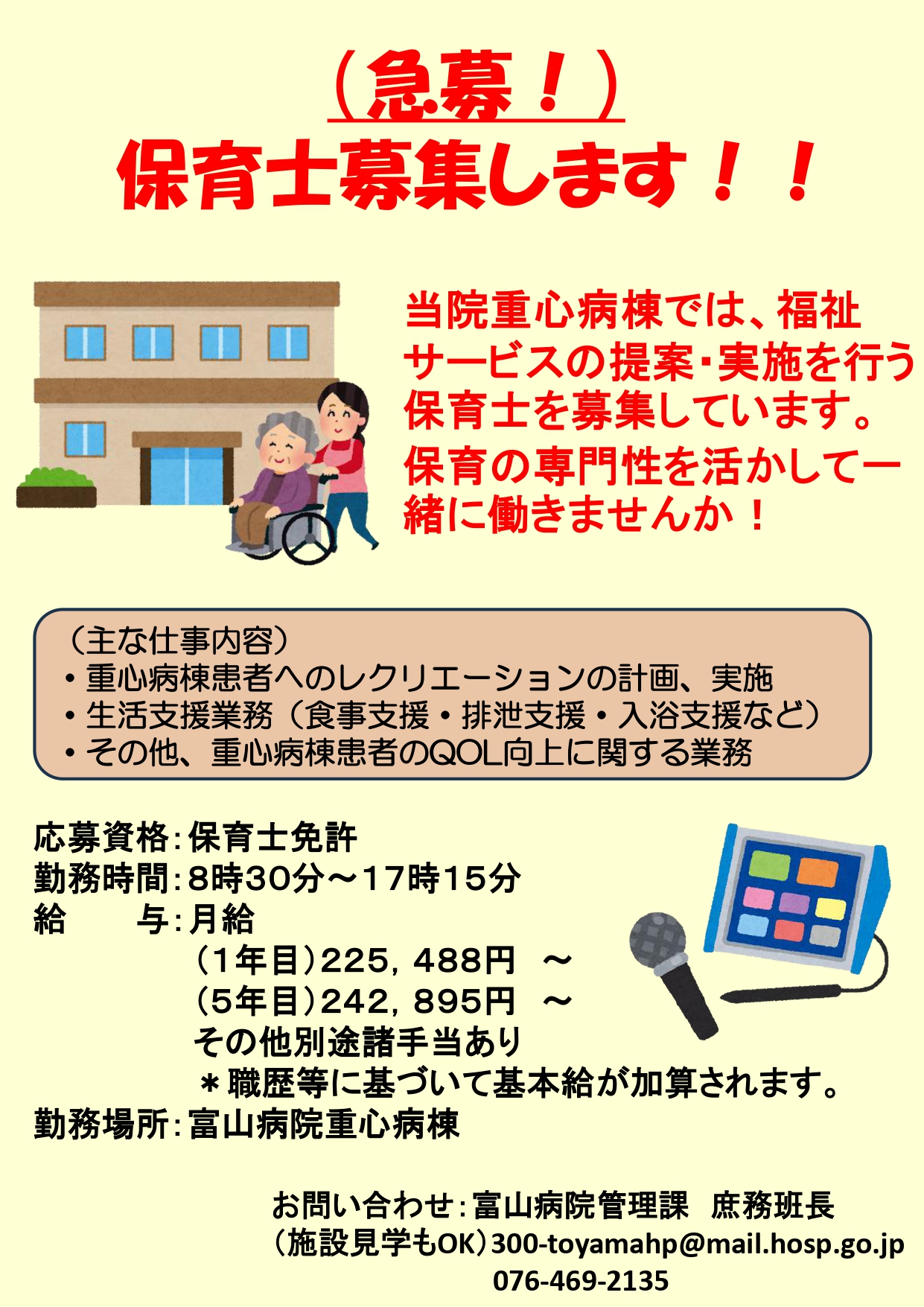 | 応募方法 | 1.書類提出 ・履歴書(写真貼付) ・保育士の資格証(写) ・卒業見込み証明書(令和8年3月保育士免許取得見込みの方) ※提出書類はお返し出来ませんので、ご了承下さい。 2.提出先・お問い合わせ先 独立行政法人国立病院機構 富山病院 管理課 庶務班長 宛 〒939-2692 富山県富山市婦中町新町3145 076-469-2135(代表) 内線2440 E-mail:300-toyamahp@mail.hosp.go.jp 3.応募期限 随時 施設見学をご希望の方は、応募方法:2.提出先・問い合わせ先 までご連絡ください。 お気軽にご連絡ください! |